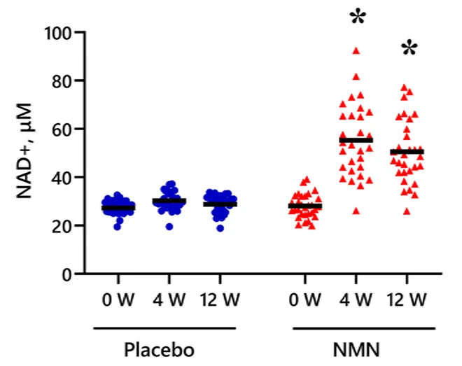 This graph shows the NMN Group (red triangles) overall had higher NAD+ levels compared to the Placebo Group (blue circles) at weeks 4 and 12.